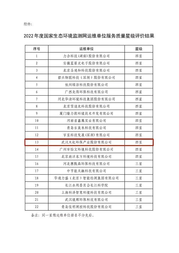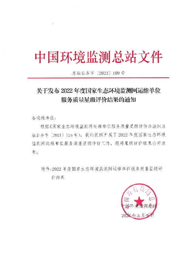 近期中國環(huán)境監(jiān)測總站根據(jù)《國家生態(tài)環(huán)境監(jiān)測網(wǎng)運(yùn)維單位服務(wù)質(zhì)量星級評價辦法》(總站業(yè)務(wù)字(2021)125 號)工作已結(jié)束,經(jīng)過中國環(huán)境監(jiān)測總站嚴(yán)格的評審和公示《總站業(yè)務(wù)字〔2023〕109號》,公司參與國家生態(tài)環(huán)境監(jiān)測網(wǎng)運(yùn)維單位服務(wù)質(zhì)量四星級榮譽(yù)(同一星級運(yùn)維單位排名不分先后)。